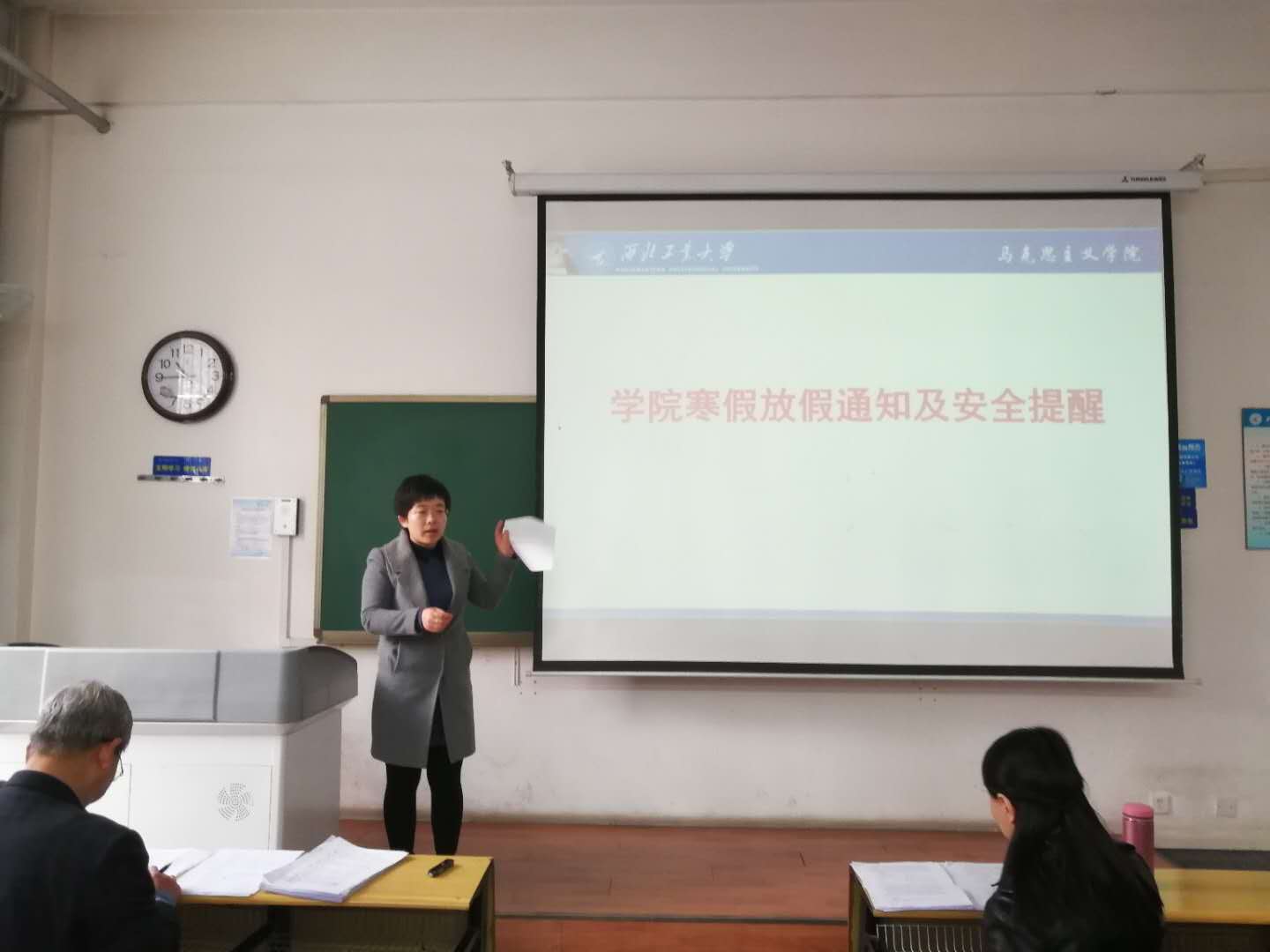 办公室主任杜瑶通报了2019年寒假放假通知并和提醒假前安全检查、教职工假期出行安全。