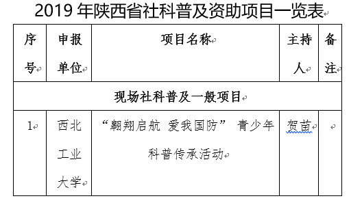 按照省科技之春领导小组办公室《关于开展陕西省第二十七届“科技之春”宣传月活动的通知》要求,省社科联下发了《关于申报2019年度陕西省社科普及活动资助项目的通知》(陕社科联〔2019〕5号),经过单位推荐,共申报了400余项科普活动。经过评审,确定立项101项,其中我院贺苗副教授申报的“翱翔启航 爱我国防” 青少年科普传承活动项目立项成功。现将获批项目予以公布。希望广大科研工作者继续努力,在各类基金项目的申报上积极主动,取得更大的突破,为必赢bwin官方网站的发展和繁荣作出新的贡献。
