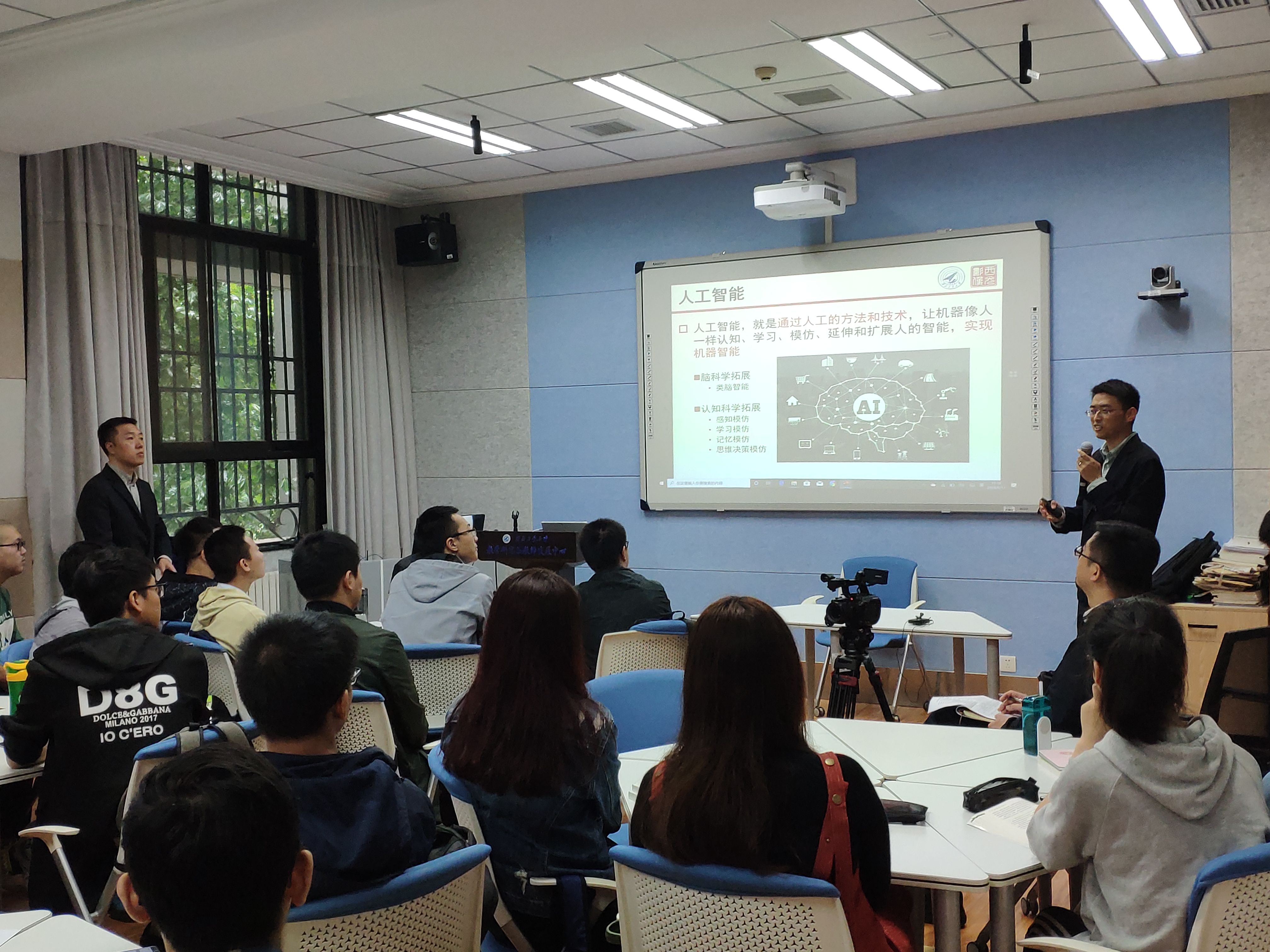 在讲授“意识的能动作用”知识点的时候,试点课引入了备受同学们关注的人工智能前沿领域,并邀请必赢bwin官方网站人才特区教授、博导王琦来到同学们中间。王琦教授研究方向为人工智能、计算机视觉、模式识别。发表学术论文共计100余篇,20余篇论文入选ESI热点/高被引论文,多篇论文获IEEE/Springer国际会议最佳论文奖,并获吴文俊人工智能优秀青年奖、陕西省科学技术一等奖、陕西省高等教育教学成果特等奖等。