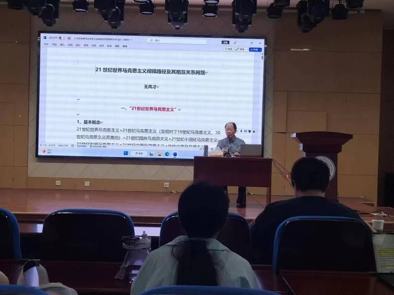 会议伊始,王凤才老师介绍了21世纪世界马克思主义的基本概念和基本格局,指出21世纪世界马克思主义研究的基本框架是从“单数的、非反思的马克思主义”到“复数的、创新的马克思主义”。接着,王老师从国外马克思学、正统马克思主义、西方马克思主义、中东欧马克思主义以及中国化马克思主义五个方面叙述了21世纪世界马克思主义的五条阐释路径;进一步阐明了“马克思主义中国化”与“中国化马克思主义”之间的关系与内涵,论述了中国特色社会主义理论对21世纪世界社会主义振兴具有重要意义。最后,王凤才老师分析了21世纪世界马克思主义阐释路径的异同,指出中国化马克思主义的阐释路径是理论与实践的统一,是21世纪世界马克思主义发展过程中最有活力、最具现实性的阐释路径。
