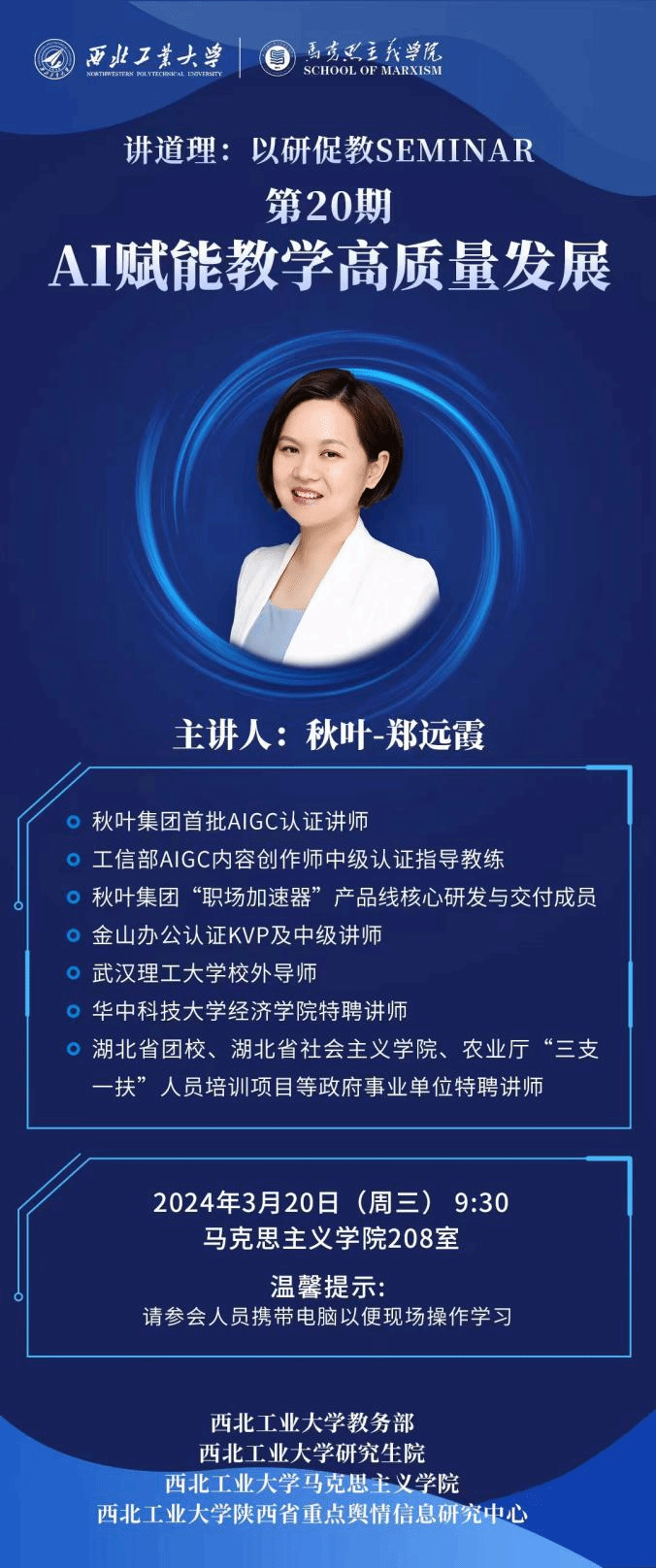 为进一步提升思政课教师教学能力水平,加强教师教学手段信息化、智能化、数字化应用,2024年3月20日上午,在学校教务部与研究生院的支持下,由必赢官网必赢bwin官方网站与学校陕西省重点舆情信息研究中心承办的第20期“讲道理——以研促教Seminar”成功举办,邀请了秋叶集团首批AIGC认证讲师郑远霞作关于“AI赋能教学高质量发展”的专题讲座。若干教师代表及学生代表参加讲座,讲座由副院长贺苗主持。
