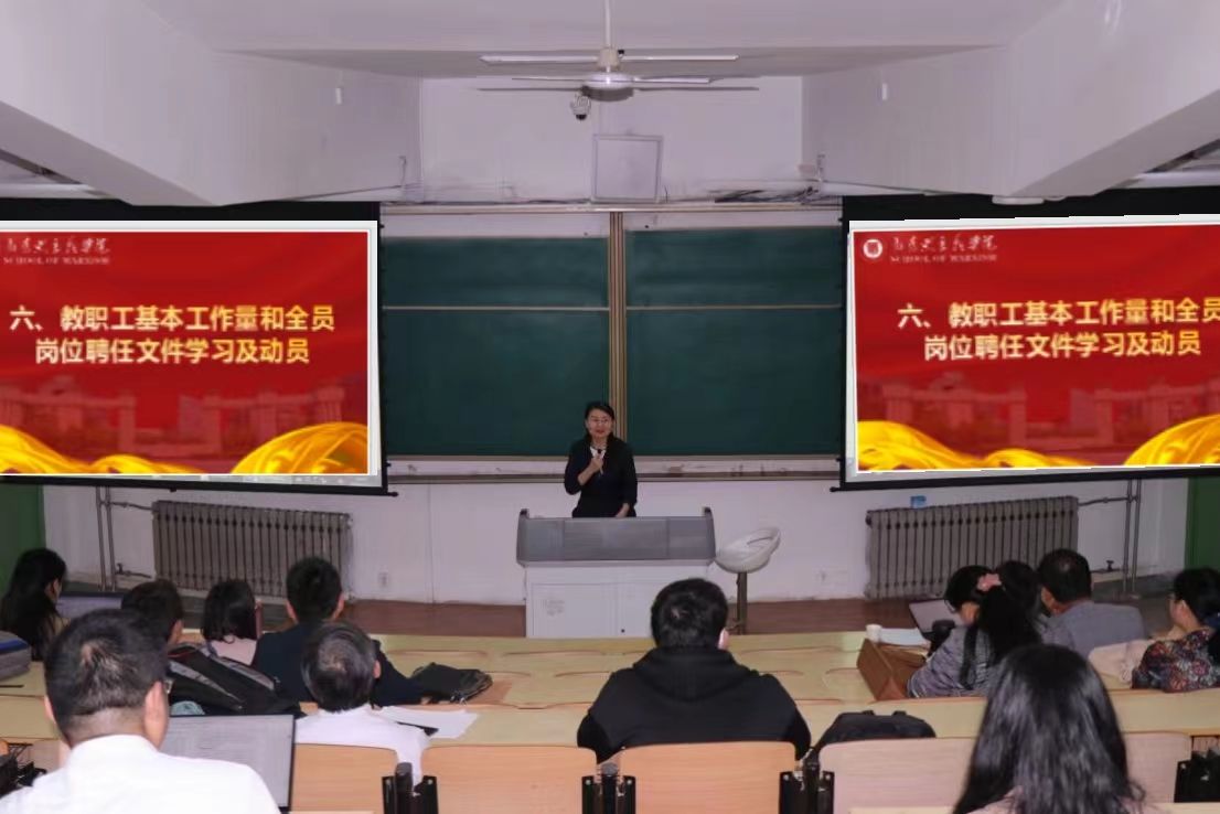 学院院长杨云霞做了关于教职工基本工作量和全员岗位聘任文件学习及动员。她围绕聘岗范围的时间、岗位聘任管理、相关要求作了工作安排,详细讲解了各岗位的工作量、工作量的组成,特别强调了岗位类型、岗位任务、岗位调整等,希望老师们积极了解学校的薪酬体系变化,鼓励各位老师积极参与岗位申报。