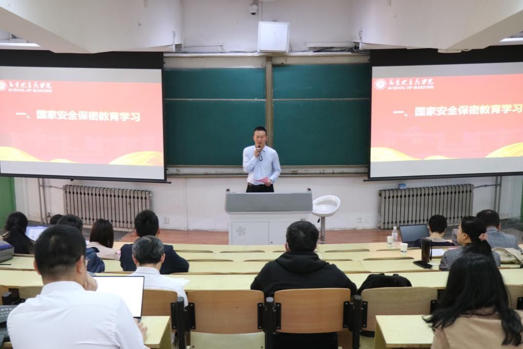 随后,蒲传新讲解国家安全保密教育学习相关内容。他指出,学院全体教职工要高度重视国家安全保密教育学习,国家安全保密教育与大家密不可分。2024年是习近平总书记提出总体国家安全观十周年,4月15日将迎来第九个全民国家安全教育日。今年宣传教育活动主题为“总体国家安全观,创新引领10周年”。蒲传新特别强调了总体国家安全观的“五大要素”“十个坚持”。随后,带领参会教职工们观看了相关视频。