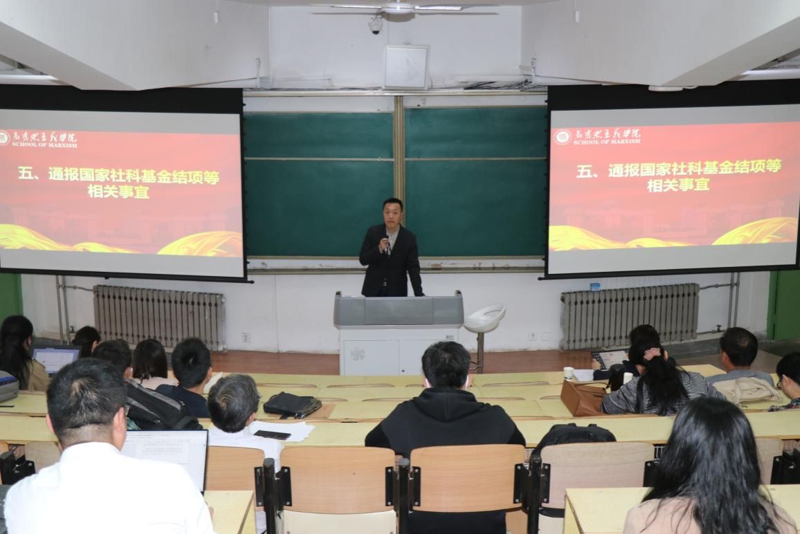 院长助理马军通报国家社科基金结项等相关事宜。他指出,重大项目招标和年度项目申报有了新的要求,各位老师务必关注相关通知做好申报工作,并且为各位老师介绍了结项和申报要求。