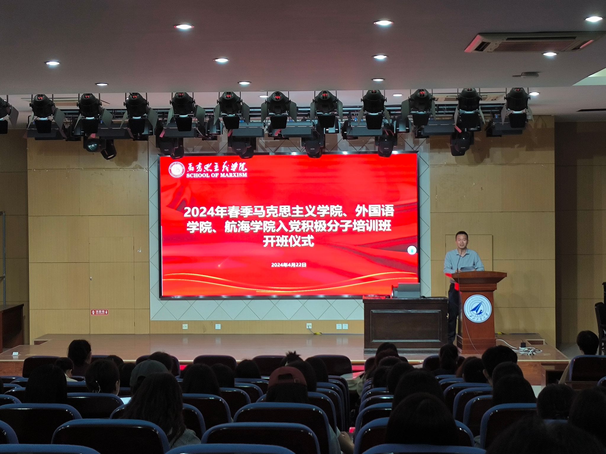 为切实做好党员发展工作,提高发展党员质量,厚实理论基础,铸牢忠党之魂,挖掘“总师育人文化”内涵,2024年4月22日晚,必赢bwin官方网站、外国语学院和航海学院联合举办了入党积极分子培训班,参加学生230余人,培训聚焦学理论、强党性、塑价值三个方面,包括专题讲座、宣讲研讨、红色观影、实践研学等环节。在开班仪式上必赢bwin官方网站党委书记蒲传新深刻阐述了党纪学习教育的重要性及其目标要求,为培训班的顺利开展奠定了坚实基础。随后,航空学院周洲教授以《谈谈我在科研成长道路上对总师文化的感悟》为题,为学员们带来了一堂极具启发性的党课。