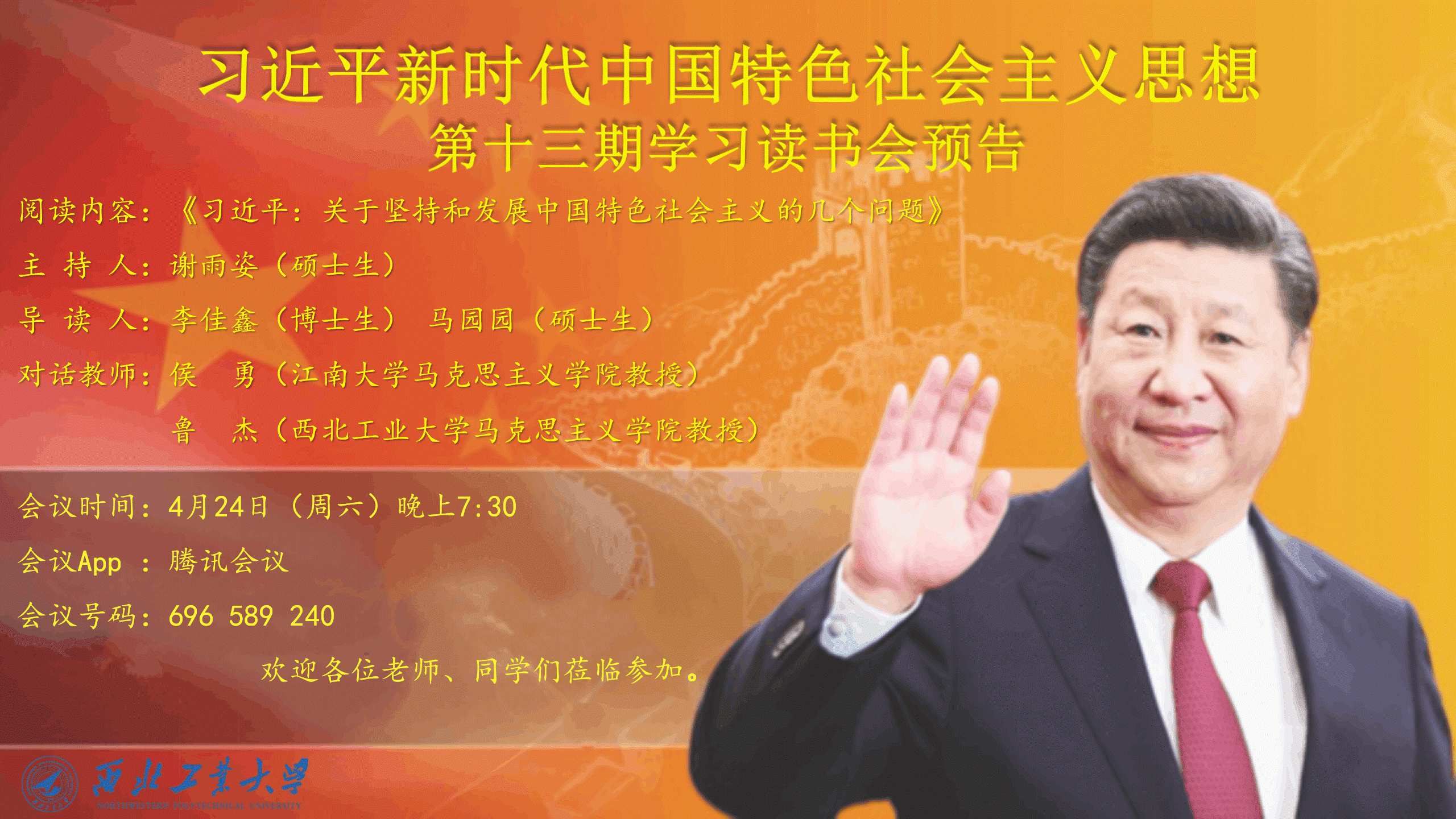 习近平总书记指出,中国特色社会主义承载着几代中国共产党人的理想和探索,寄托着无数仁人志士的夙愿和期盼,凝聚着亿万人民的奋斗和牺牲,是近代以来中国社会发展的必然选择,是发展中国、稳定中国的必由之路。因此,我们必须坚定不移地走中国特色社会主义道路,只有坚持和发展中国特色社会主义才能实现中华民族伟大复兴。2021年4月24日,必赢bwin官方网站习近平新时代中国特色社会主义思想学习读书会第十三期活动主题围绕《习近平:关于坚持和发展中国特色社会主义的几个问题》进行学习研讨。本次读书会由我院思想政治教育系主任、博士生导师鲁杰教授发起,学院硕士生谢雨姿主持,特邀请江南大学必赢bwin官方网站侯勇教授参与指导。