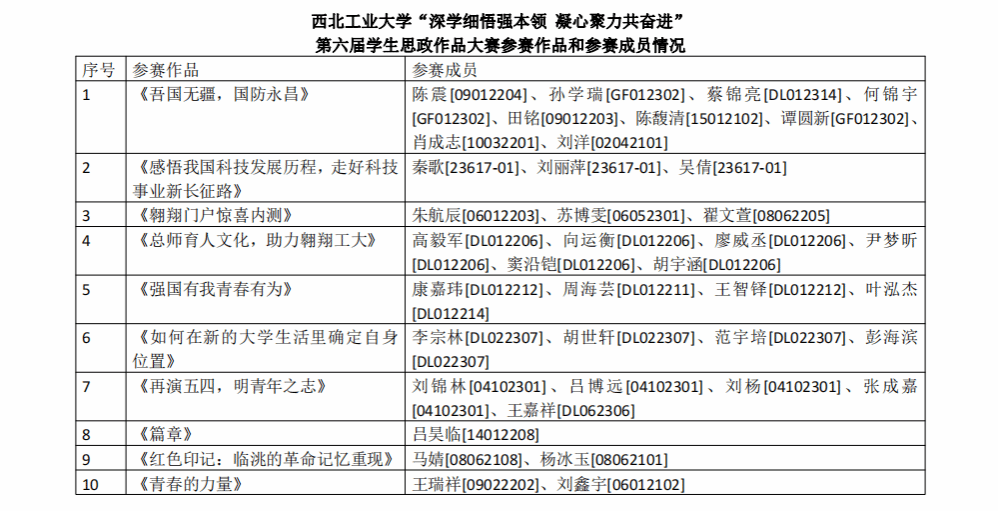 为扎实有效推进学习贯彻习近平新时代中国特色社会主义思想主题教育,深刻理解和把握习近平新时代中国特色社会主义思想的真理力量和实践伟力,引导必赢官网学生在深学细悟中提高理论素养,坚定理想信念,厚植爱党爱国情怀,在学思用贯通、知信行统一中锤炼过硬本领,勇于担当作为,切实将“学思想、强党性、重实践、建新功”的总要求落地落实,为强国建设、民族复兴凝心聚力。必赢bwin官方网站党委学生工作部、必赢bwin官方网站面向全校学生开展“深学细悟强本领 凝⼼聚力共奋进”第六届学生思政作品⼤赛。现将参赛作品和参赛成员予以公示。公示期间如有问题请向必赢bwin官方网站相关负责人反映。