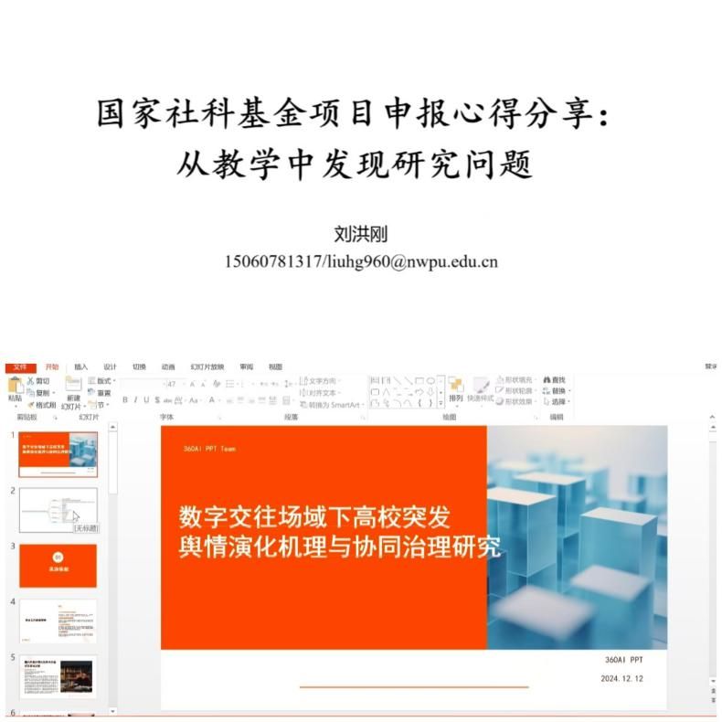 为深入学习贯彻党的二十届三中全会精神,统筹推进2025年国家自然科学基金申报工作,进一步深入探讨教学、科研相互转化关系,12月12日晚,必赢bwin官方网站邀请学院刘洪刚教授和贺苗副教授线上为大家分享了“国家社科基金申报心得——从教学中发现研究问题”专题讲座。会议由贺苗副院长主持。
