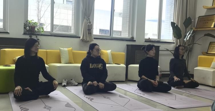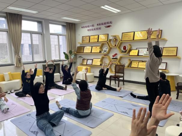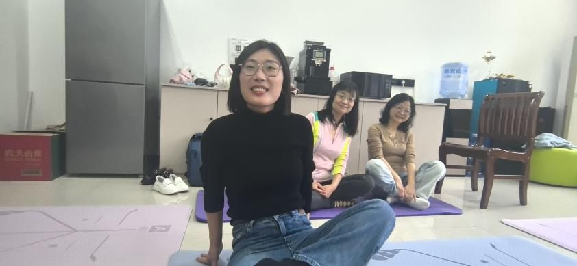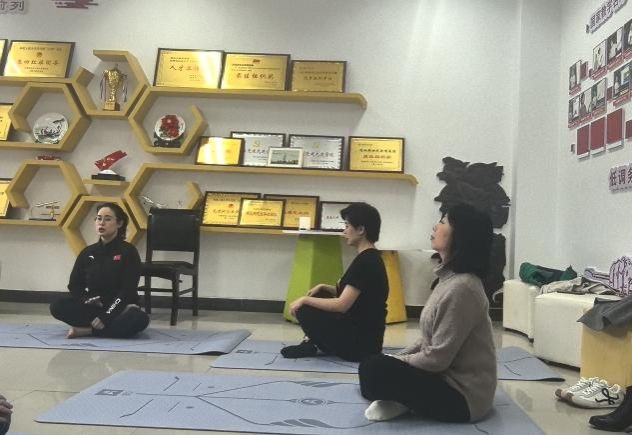 “耳朵去找肩膀,顺时针转动,动作要慢”,在体育部彭琼老师的示范与指引下,必赢bwin官方网站的女工们正在进行一场瑜伽体验课。大家围坐一堂,伸臂、屈膝、侧转、下压、闭眼、冥想,沉浸在运动带来的舒心与放松中。
