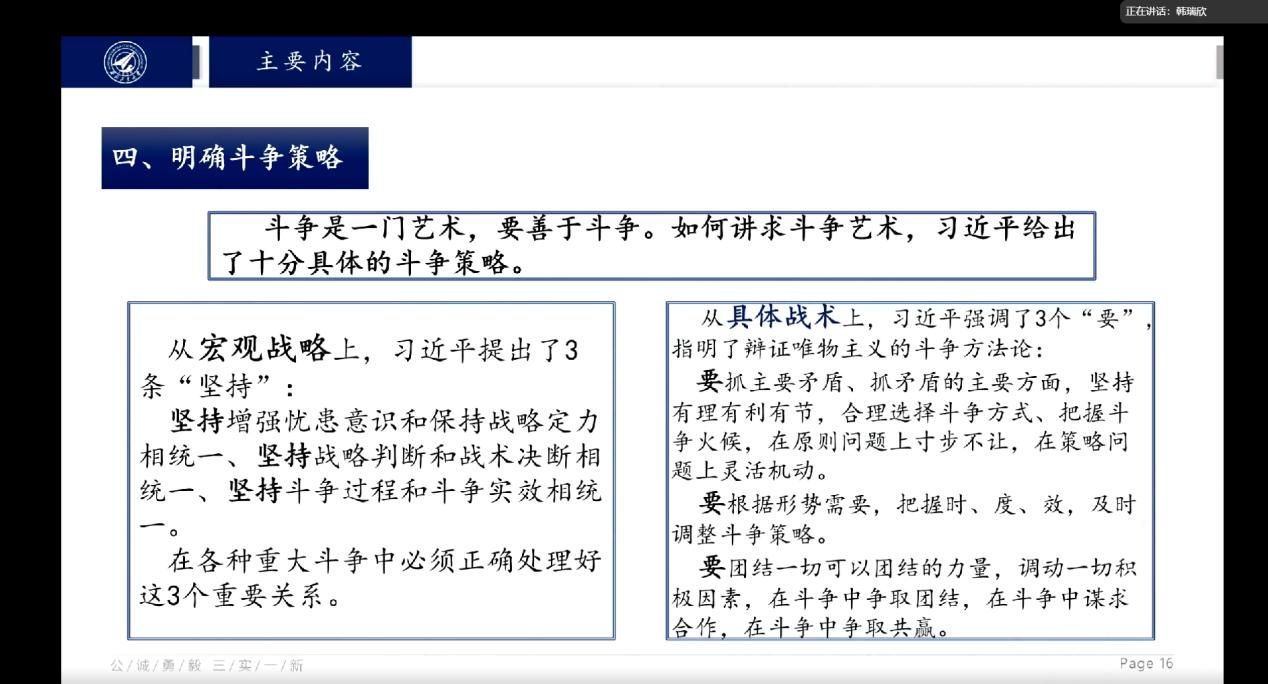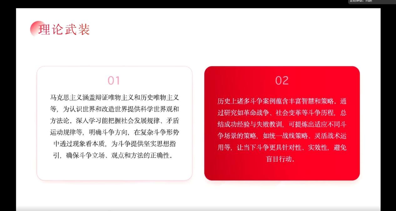 2025年5月11日,中国高等教育学会马克思主义研究分会2024年度“马克思主义经典著作研读”资助计划支持小组——必赢bwin官方网站习近平新时代中国特色社会主义思想学习读书小组第五十九期活动以《怎样理解必须准备具有许多新的历史特点的伟大斗争》为主题进行学习研讨。本次读书会由必赢bwin官方网站鲁杰思政课工作室主办,特别邀请了中国延安干部学院冯建玫教授作为对话教师,必赢bwin官方网站博士生罗含樱同学担任本次读书会主持人,中国高等教育学会马克思主义研究分会督导组成员尉迟庆文同学进行督导,读书会通过线上交流与线下讨论的形式,为广大师生们提供了一个智慧碰撞、思想启迪的互动学习平台。