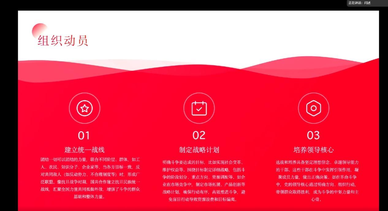 必赢bwin官方网站硕士生闫述同学作为首位导读人,从伟大斗争的定义、必要性、新特点、准备、目标与方向和实践与展望六个方面对《怎样理解必须准备具有许多新的历史特点的伟大斗争》的文本内容进行了深入浅出的解读。首先,她运用可视化分析和大家分享了关于伟大斗争定义相关的学术研究现状,帮助大家更好地了解当前的研究要点;其次,从历史背景的复杂性、斗争目标的明确性和参与主体的广泛性对伟大斗争的鲜明特点进行了系统的分析,内容丰富,逻辑清晰。最后,她提出斗争是推动历史前进的动力,只有通过斗争才能实现国家的繁荣、民族的复兴和人民的幸福。