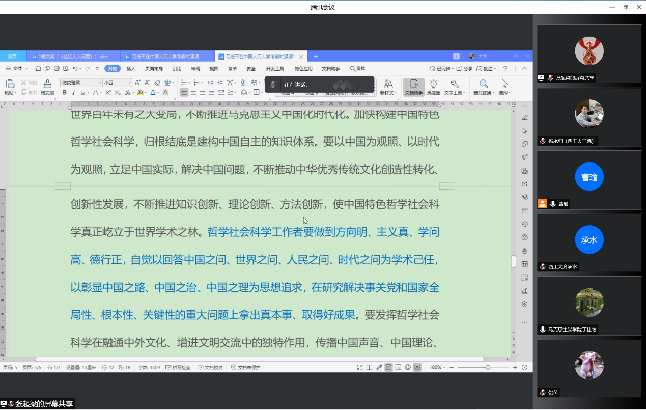 为进一步学习贯彻落实习近平总书记4·25人大考察讲话精神,落实好学校和必赢bwin官方网站关于思政课建设和思政课教师队伍发展的新部署新要求,探寻当前“原理课”课程建设与改革创新等方面的意见,4月30日晚,马院马克思主义基本原理系党支部在线组织召开了讲话精神学习座谈会。马原系全系17名党员同志以及学院党委副书记(主持工作)蒲传新应邀参加会议,会议由支部书记曹瑜主持。