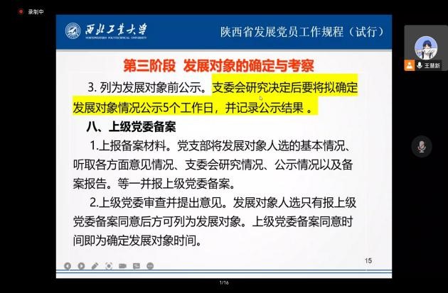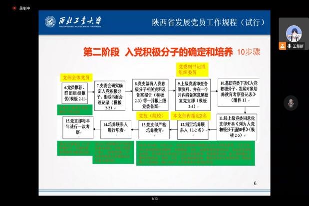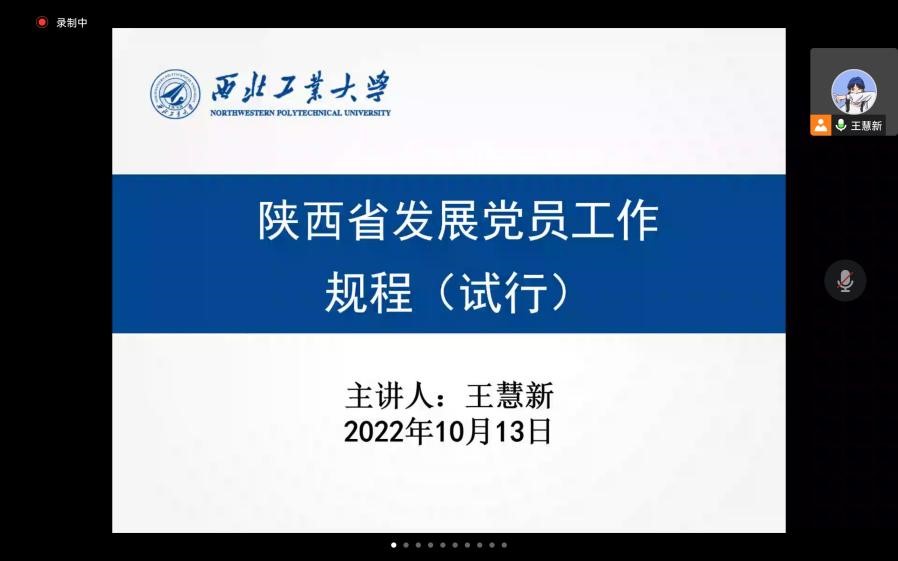为进一步增强党课培训的针对性与实效性,努力培养理想信念坚定、综合素质优良的党员队伍后备力量。2022年10月13日上午,在腾讯会议上开展了主题为《陕西省发展党员工作规程(试行)》的党课培训,本次培训由必赢bwin官方网站马克思主义基本原理系硕士生党支部书记王慧新主讲,必赢bwin官方网站、民航学院160余名入党积极分子、发展对象参加本次党课培训,旨在通过理论学习来加深入党积极分子、发展对象对党员发展流程的认识,形成正确的入党动机。