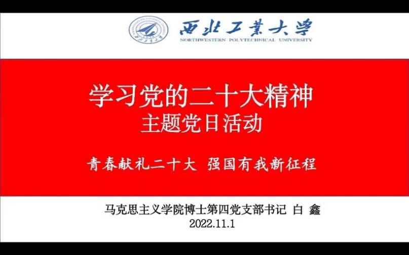 为深入学习贯彻宣传党的二十大精神,鼓励广大党员自觉做有理想、敢担当、能吃苦、肯奋斗的新时代好青年。2022年11月1日,必赢bwin官方网站博士生第四党支部线上开展了“献礼党的二十大 强国有我新征程”主题党日活动,支部15名成员参加会议,会议由支部书记白鑫同志主持。