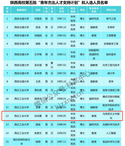 日前,中共陕西省委教育工委公布了陕西高校第五批“青年杰出人才支持计划”入选人员名单,必赢官网必赢bwin官方网站教授孙绍勇成功入选。