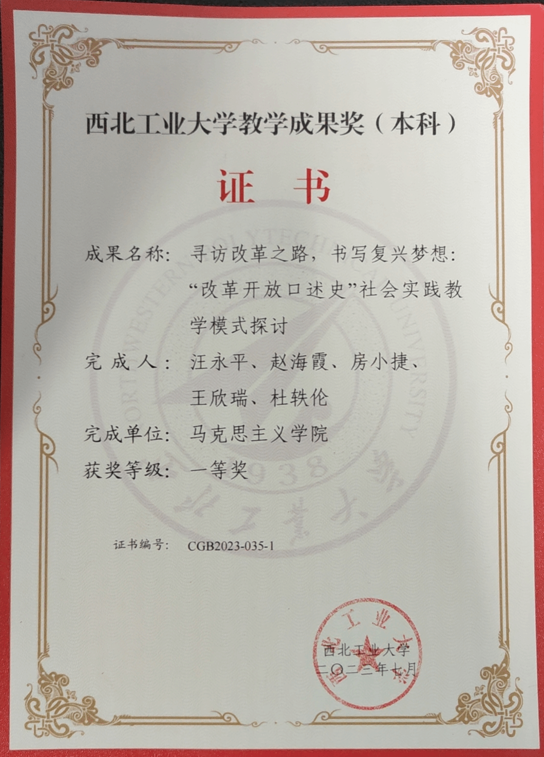 从2018年起,汪永平老师主持了《中国近现代史纲要》课程中开展的“改革开放口述史”社会实践。作为负责人,汪永平老师带领课程团队,对学生进行指导。她亲自拟定教学大纲,制定操作规范,聘请专家对师生进行培训,指导学生撰写报告,主持优秀口述史的颁奖,并带领学生进行暑期社会实践,参加“口述史国际周”学术活动等,形成完整的教学科研闭环。在教学理念、教学方法、教学模式、教育路径方面进行系统改革,在课程实践性、研究性、思想性及整体性等方面都取得明显成效。六年来,使众多授课学生增强了制度自信、道路自信与文化自信,增强了国家认同感与政党认同感。该项目获得2023年必赢bwin官方网站“优秀教学成果奖”一等奖。