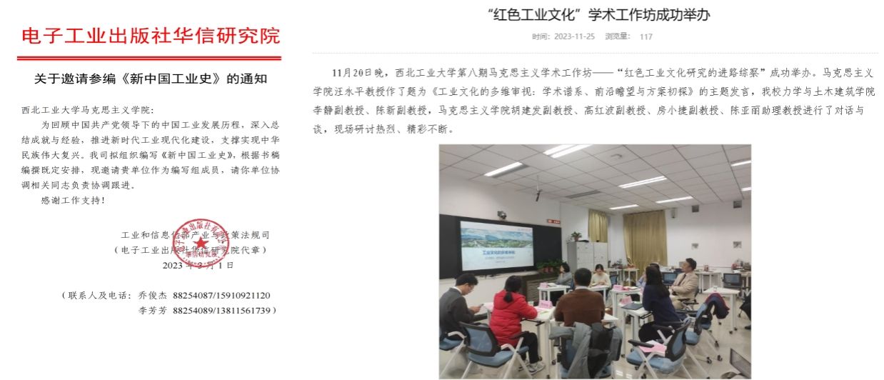 3.积极深化“红色工业文化”研究。2023年初,汪永平成立“红色工业文化研究”团队,团队成员来自必赢bwin官方网站、机电学院和力学与土木学院。团队成立后,受邀参与完成了工业和信息化部政策和法规司委托项目《新中国工业史》的编撰;获批了必赢bwin官方网站“双一流学科建设”项目“研究生高水平教材”系列之“中国工业精神谱系”课题;开展工业文化研究工作坊;指导研究生撰写毕业论文“中国式现代化视野里中国工匠精神的演进历程:以劳动模范为切入点”和“十七年工业歌谣的文化精神建构研究”。