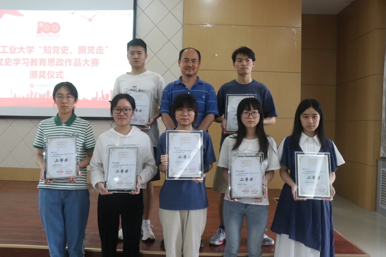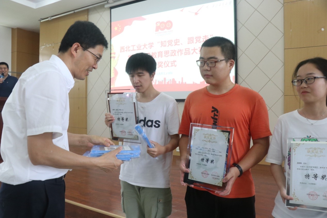 首先,李刚老师对获奖的同学们表示祝贺,对各位老师的到来表示感谢。随后,颁奖仪式正式开始,在坚定有力的《钢铁洪流进行曲》中,山磊老师、贺苗老师为获得三等奖的同学颁奖;张云龙老师为获得二等奖的同学颁奖;吴闻川老师为获得一等奖的同学颁奖;代富平老师为获得特等奖的同学颁奖。本次大赛奖品丰厚,由全校马院思政课教师组织各班同学参与,以讲好党的百年故事为主题制作思政作品,同学们积极报名,踊跃参加,自6月7日起,在学校bilibili官方平台持续展播100期。
