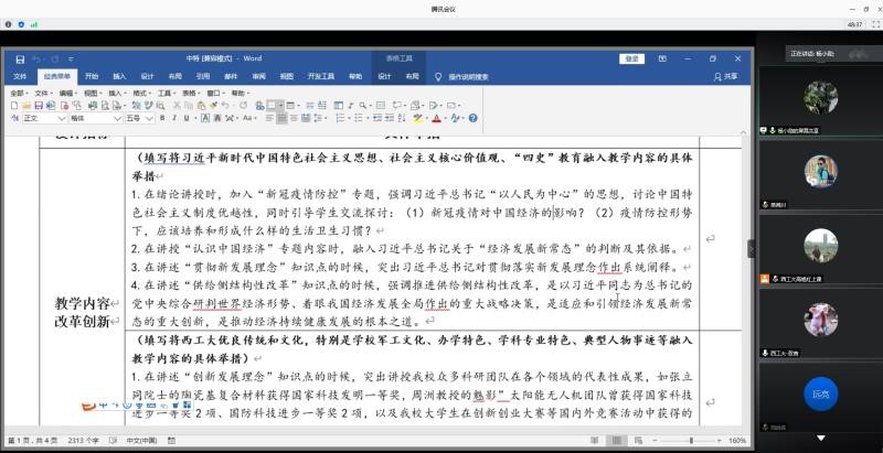 备课会首先进行分组说课,各位任课教师按照学院下发的《必赢bwin官方网站2020-2021秋学期思政课改革创新教学设计规划表》,结合授课专题,从教学内容、教学模式、教学方式、教学资源等方面对课程创新点进行了充分规划设计。将习近平新时代中国特色社会主义思想、社会主义核心价值观、“四史”教育、西工大优良传统和文化、时政热点等有机融入课程,对探究式、体验式、互动式、分众式以及线上线下混合式、现场教学等教学模式以及课堂辩论、演讲、展示、邀请专家同上一堂思政课、远程连线专家、雨课堂信息技术手段运用等教学方法都进行了有效尝试,并充分挖掘慕课、优质教辅材料、视频资料等教学资源。四位点评教授分别对每位教师的说课从内容到形式进行了精彩点评。