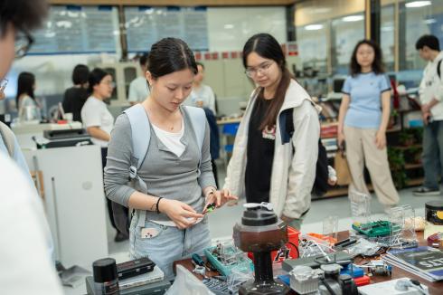 随后组织学员系统参观创新实践社区,讲解“无人飞行器实验室”“机器人创新实践工坊”和“创意孵化空间”等专项平台的功能定位与运行机制,使同学们得以直观感知科技创新实践场域的魅力,有效激发工程实践的探索热忱。通过系统阐述多个创新项目成果转化案例,梁老师具体论证了理论知识向工程应用转化的可行路径,显著强化了同学对专业发展前景的认知信心。