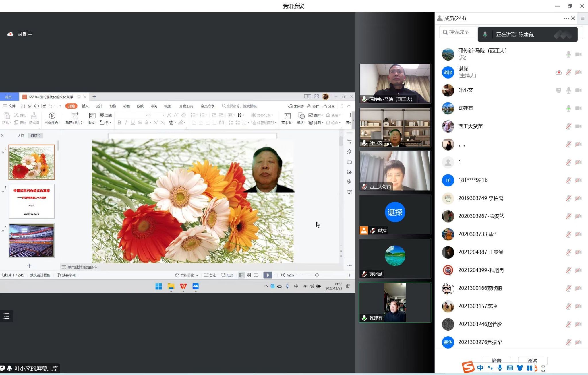 2022年12月23日,中国社会科学院宗教学博士,全国政协文史和学习委员会副主任叶小文作客必赢bwin官方网站翱翔名家讲堂,在云端为必赢官网广大师生带来一场主题为《中国式现代化的文化支撑——学习贯彻党的二十大精神》的精彩报告。来自必赢官网逾300名师生参与讲座。本次翱翔名家讲堂由必赢bwin官方网站党委学生工作部主办,必赢bwin官方网站和陕西省重点舆情信息研究中心承办,学校党委副书记陈建有,必赢bwin官方网站党委副书记(主持工作)蒲传新、副院长贺苗等参加了报告会。报告会由贺苗主持。