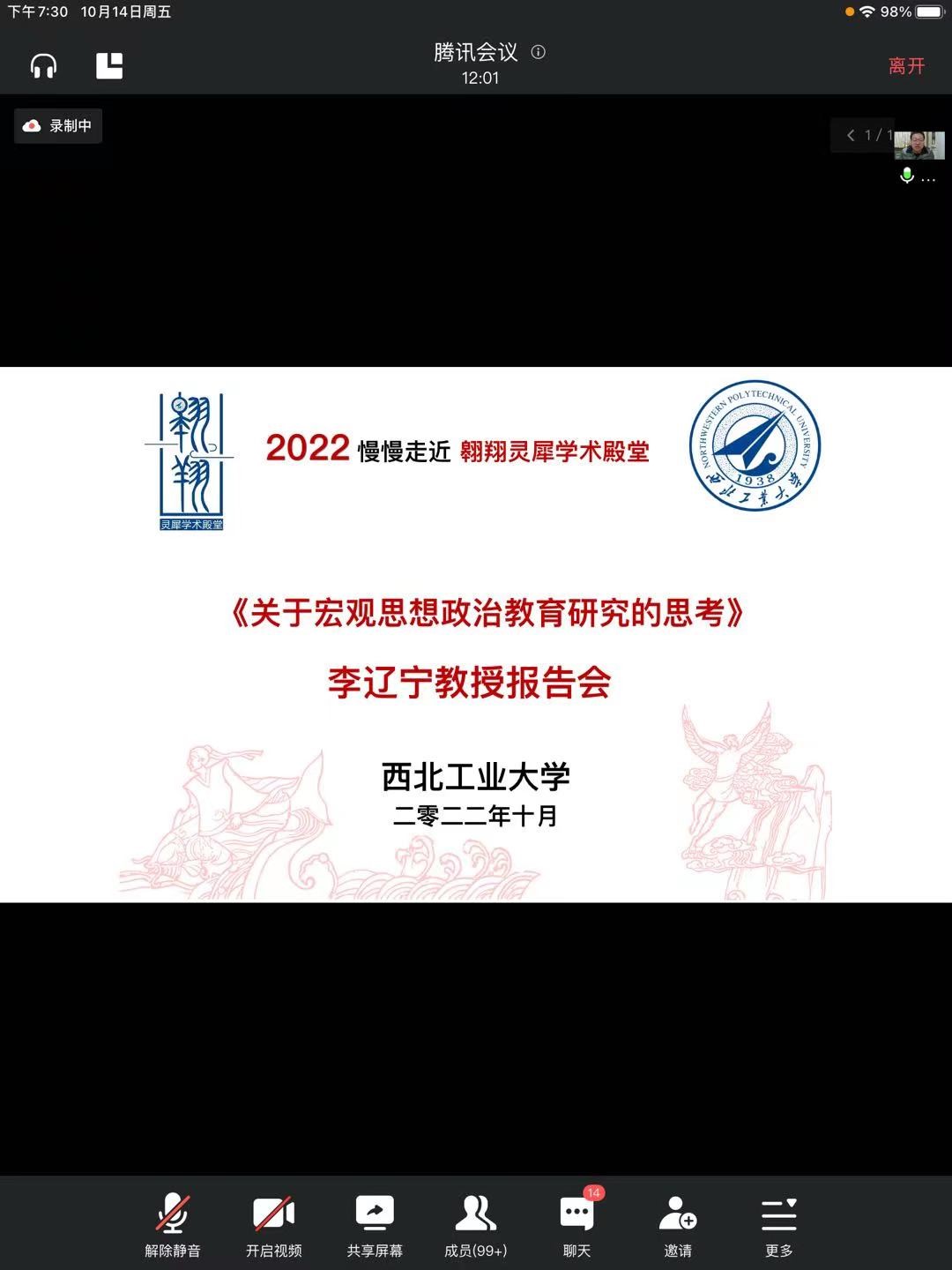 2022年10月14日晚19:30,国家社科基金重大项目首席专家、国家社科基金年度项目通讯评审专家、四川大学必赢bwin官方网站李辽宁教授应邀做客必赢官网“翱翔灵犀学术殿堂”,通过腾讯会议平台直播的形式为我们带来了一场主题为《关于宏观思想政治教育的思考》的精彩报告。必赢bwin官方网站思想政治教育系主任鲁杰教授主持报告会,来自必赢bwin官方网站、四川大学、东北大学等200余名师生共同参加了此次活动。