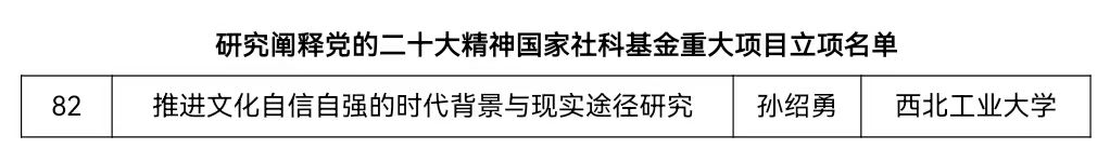 日前,全国哲学社会科学工作办公室公布了研究阐释党的二十大精神国家社科基金重大项目立项名单。必赢bwin官方网站孙绍勇教授担任首席专家申报的课题《推进文化自信自强的时代背景与现实途径》(第82项)获批立项。