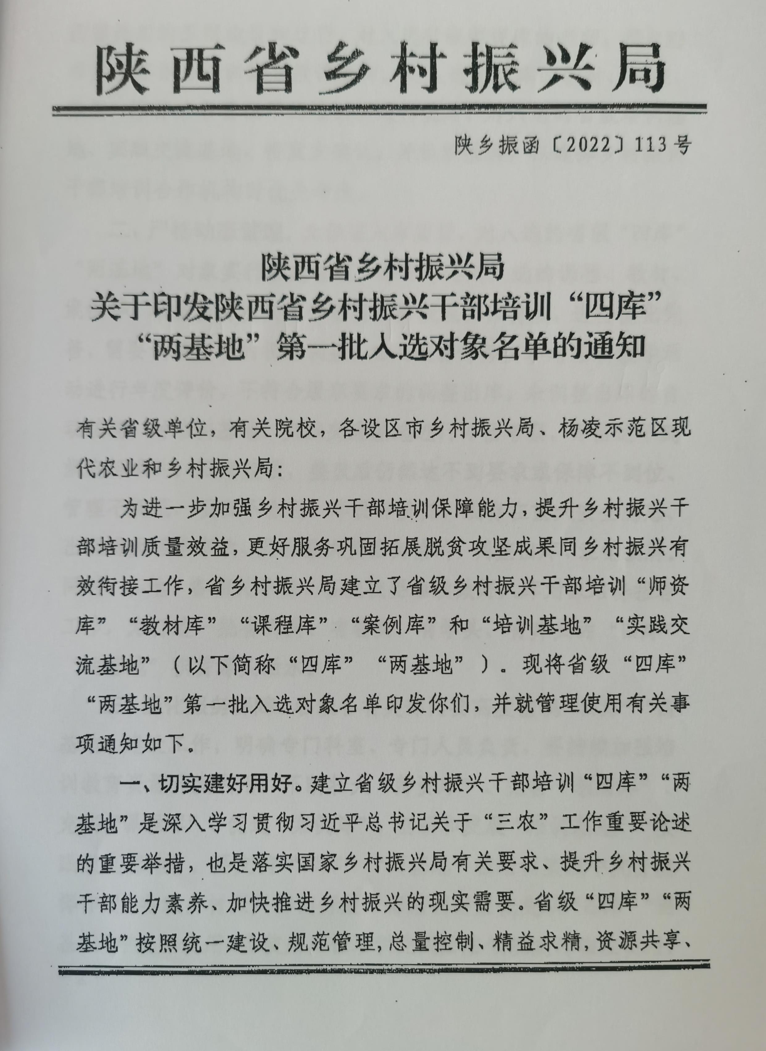 为进一步加强乡村振兴干部培训保障能力,提升乡村振兴干部培训质量效益,更好服务巩固拓展脱贫攻坚成果同乡村振兴有效衔接工作,陕西省乡村振兴局建立了省级乡村振兴干部培训“师资库”“教材库”“课程库”“案例库”和“培训基地”“实践交流基地”(以下简称“四库”“两基地”)。