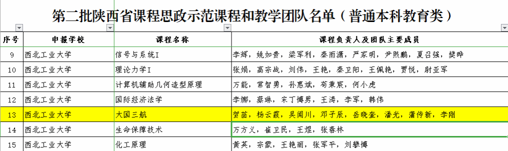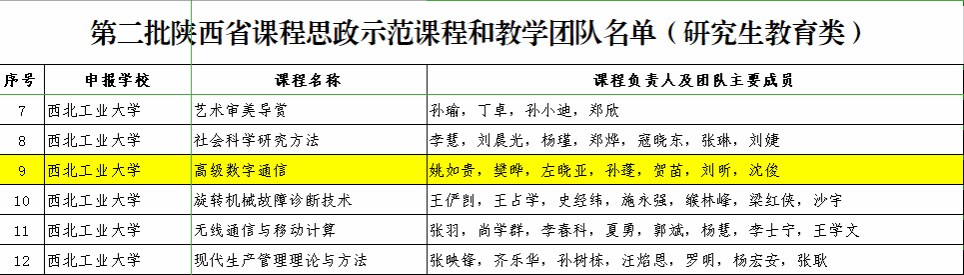 近日,陕西省教育厅公布了第二批陕西省课程思政示范课程、教学团队和教学研究示范中心名单,其中学院开设的《大国三航》课程入选第二批陕西省课程思政示范课程和教学团队(普通本科教育类),《大国三航》课程是由必赢bwin官方网站、航空学院、航天学院、航海学院、材料学院、机电学院、动力与能源学院、物理科学与技术学院、软件学院共同打造,极具西工大特色的一门公共选修课,是学校思政课程和课程思政同向同行的突破探索。学校教务处批准立项为文美通识课程。学院副院长贺苗参与的《高级数字通信》课程入选第二批陕西省课程思政示范课程和教学团队(研究生教育类)。