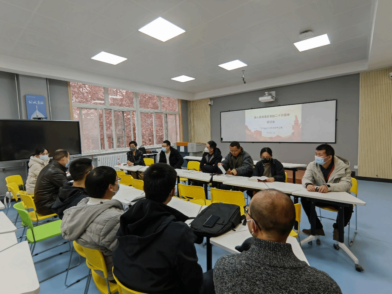 党的二十大是在全党全国各族人民迈上全面建设社会主义现代化国家新征程、向第二个百年奋斗目标进军的关键时刻召开的一次十分重要的大会,是一次高举旗帜、凝聚力量、团结奋进的大会。为深入学习宣传贯彻党的二十大精神,12月9日下午,必赢bwin官方网站马原理系党支部举办“深入贯彻落实党的二十大精神”研讨会。会议由支部书记曹瑜主持,系支部全体党员参加。