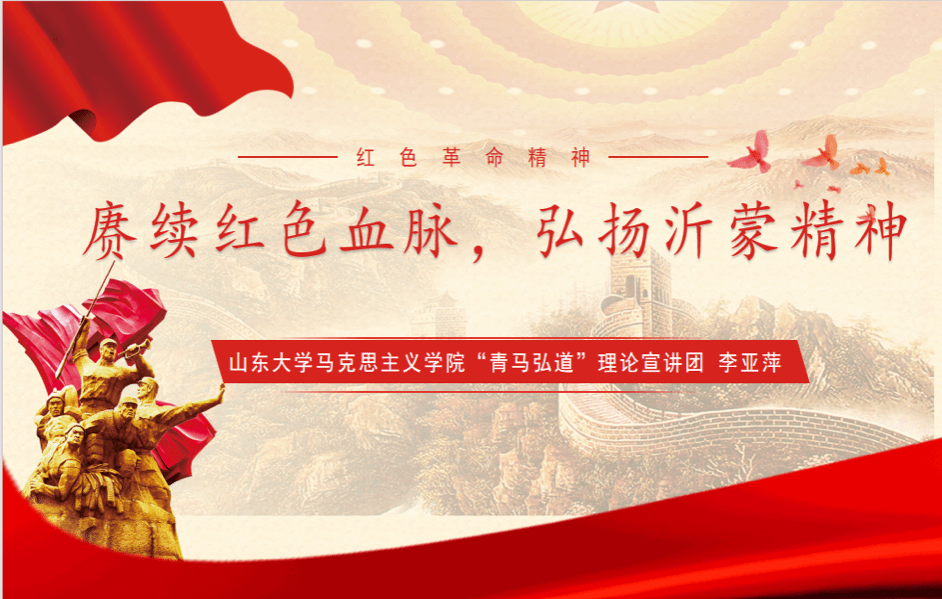 山东大学必赢bwin官方网站“青马弘道”理论宣讲团成员李亚萍以《赓续红色血脉,弘扬沂蒙精神》为题进行宣讲。李亚萍同学围绕沂蒙精神的基本内涵、生成逻辑、践行路径三个层次展开阐释,强调只有尊重人民群众的历史首创精神,依靠人民群众这一真正的铜墙铁壁,才能赢得革命和建设事业的胜利和成功。