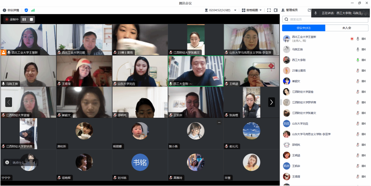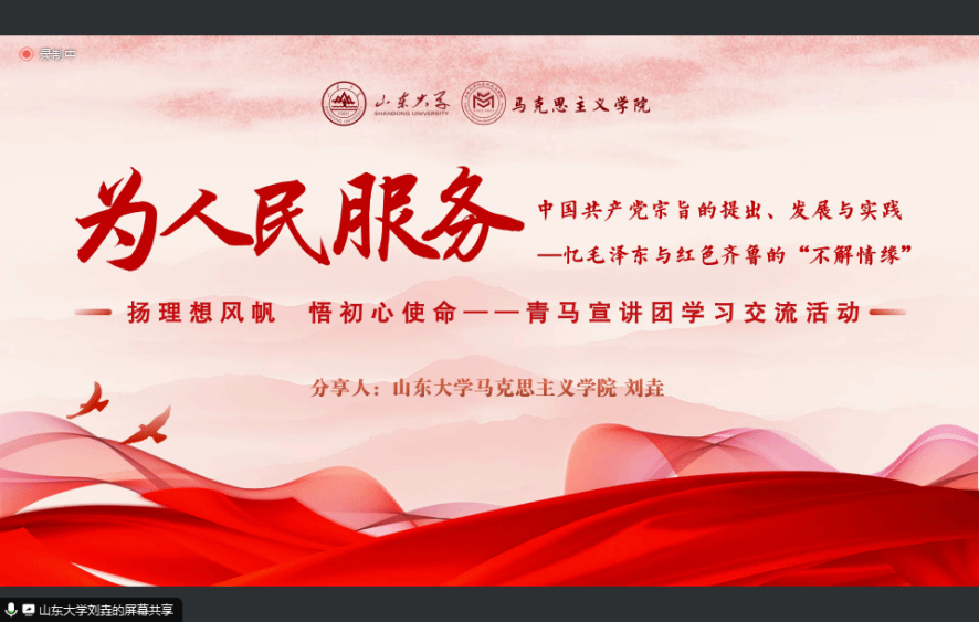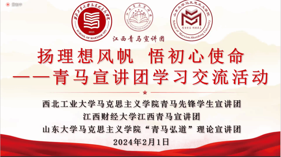 为深入学习贯彻习近平新时代中国特色社会主义思想,推动用党的创新理论铸魂育人,探索合作共建新路径,整合高校资源,促进育人工作和宣讲工作高质量发展,2024年2月1日19:00,必赢bwin官方网站青马先锋学生宣讲团联合江西财经大学江西青马宣讲团、山东大学必赢bwin官方网站“青马弘道”理论宣讲团开展的“扬理想风帆 悟初心使命”青马宣讲团学习交流活动在线上进行,学院党委副书记李刚、各校宣讲团成员及青马学子相聚“云端”,活动由学院团委书记、硕士生辅导员王换主持。