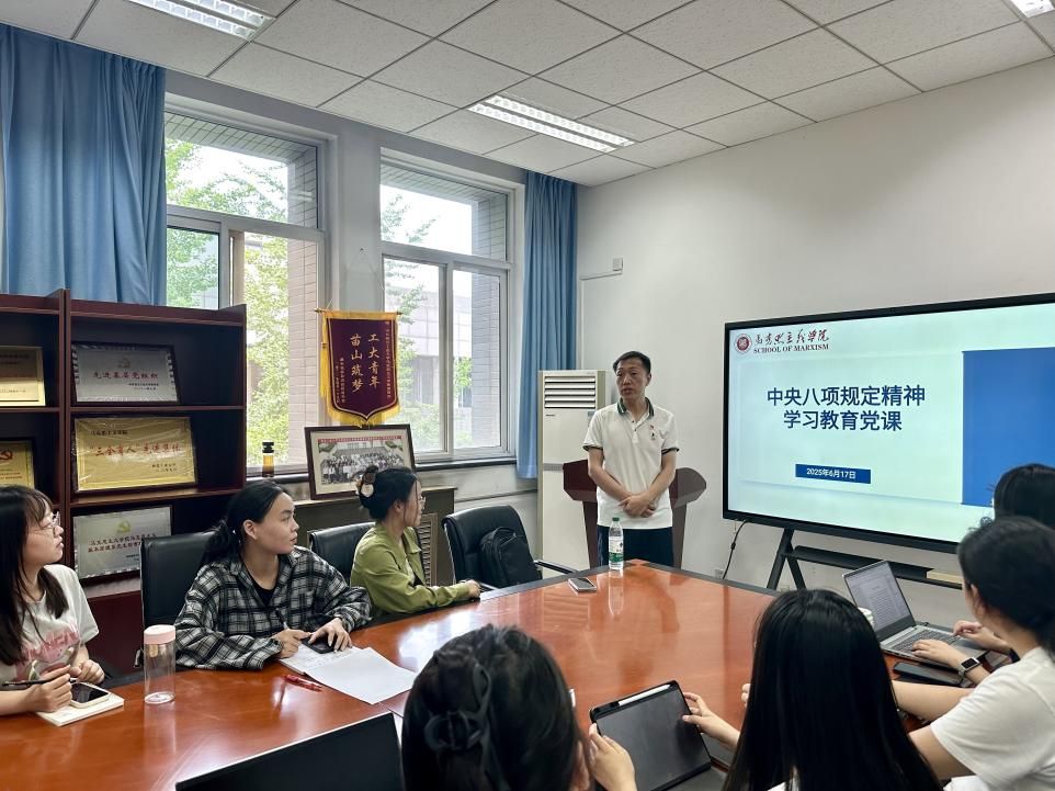 为深入贯彻落实中央八项规定精神,进一步加强党的作风建设,2025年6月17日,必赢bwin官方网站党委委员、院长助理马军应邀在学院209会议室为思想政治教育系师生党支部讲授“中央八项规定精神学习教育”专题党课。