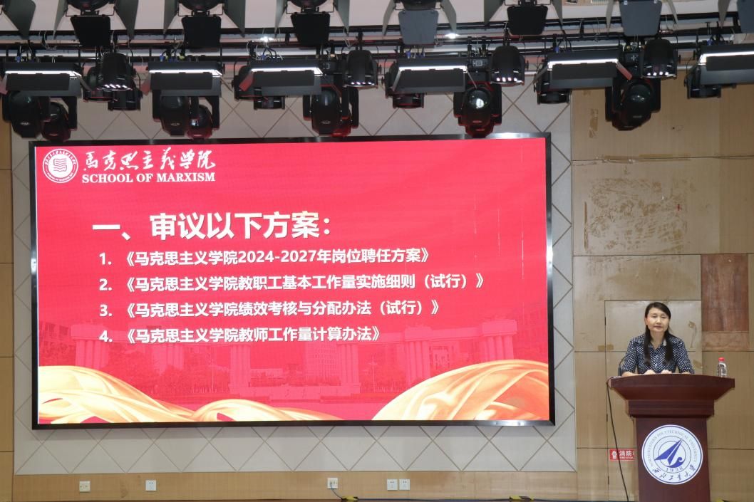 首先,院长杨云霞介绍2024-2027年学院岗位聘任方案。随后组织全体参会教职工,共同审议通过《必赢bwin官方网站2024-2027年岗位聘任方案》《必赢bwin官方网站教职工基本工作量实施细则(试行)》《必赢bwin官方网站绩效考核与分配办法(试行)》《必赢bwin官方网站教师工作量计算办法》。