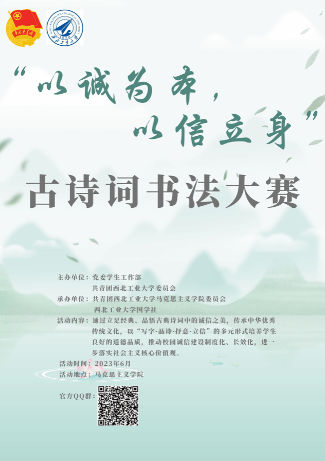 执起手中之笔,落一幅水墨蹁跹,传诚信之道,扬诚信之风。本次书法大赛,不仅展示了西工大学子的书法风采,丰富了校园文化生活,还有助于青年学生在个人创作中坚定理想信念,筑牢信仰之基,彰显诚信本色,切实做诚信的“躬行”者,为明天书写奋发之章节。