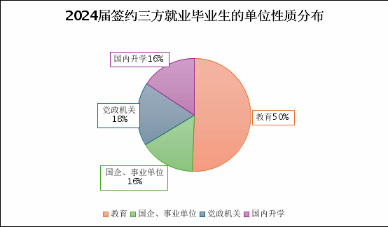 2024年必赢bwin官方网站毕业生共计46人,整体就业率96%。其中,博士毕业生12人,就业率100%;硕士毕业生34人,就业率94%。总体而言,就业岗位与学科方向契合度强、硕士生升学率占比突出。从单位所属行业来看,毕业生就业人数较多的行业主要是教育行业,共计22人签约思政课教师、辅导员,占比50%。同时,硕博毕业生中有8人进入党政机关,其中4人选择选调生队伍,赴陕西、山西省份扎根基层、挺膺青春担当。针对2024届毕业生签约单位开展问卷调研,收到来自高等学校、职专院校、研究所、党政机关共18家用人单位的一致好评。