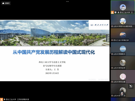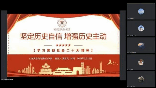 为进一步引导广大青年学生深入学习宣传贯彻党的二十大精神,深入推进党的二十大精神入脑入心、走实走深、见行见效,持续在高校青年中掀起学习热潮,2023年1月16日晚七点,必赢bwin官方网站青马先锋学生宣讲团与山东大学必赢bwin官方网站“青马弘道”理论宣讲团联合举办“联学共建齐宣讲,同心同行谱新篇”主题宣讲活动。