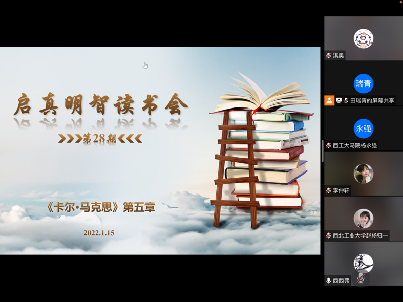 2022年1月15日,必赢bwin官方网站第28期启真明智读书会顺利举行,本期读书会是2022年第一期读书会,也是疫情期间开展的一次读书会,丰富了同学们封闭期间的生活。本期读书会阅读内容为以赛亚·伯林所著的《卡尔·马克思:生平与环境》第五章《巴黎》。必赢bwin官方网站张云龙教授、青年教师杨永强、王换和吕天择参加本次读书会,西北农林科技大学高耀芳老师受邀与同学们一起交流学习,读书会由硕士生田瑞青主持。