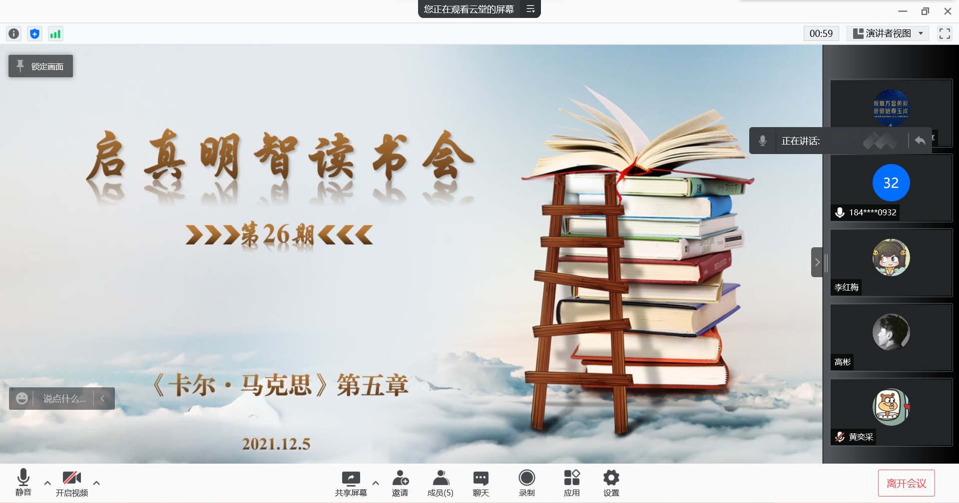2021年12月5日,必赢bwin官方网站第26期启真明智读书会顺利举行。本期读书会阅读内容为以赛亚·伯林所著《卡尔·马克思:生平与环境》第五章《巴黎》,必赢bwin官方网站张云龙教授、青年教师杨荣、吕天择、杨永强受邀与同学们一起交流学习,读书会由硕士生田瑞青主持。