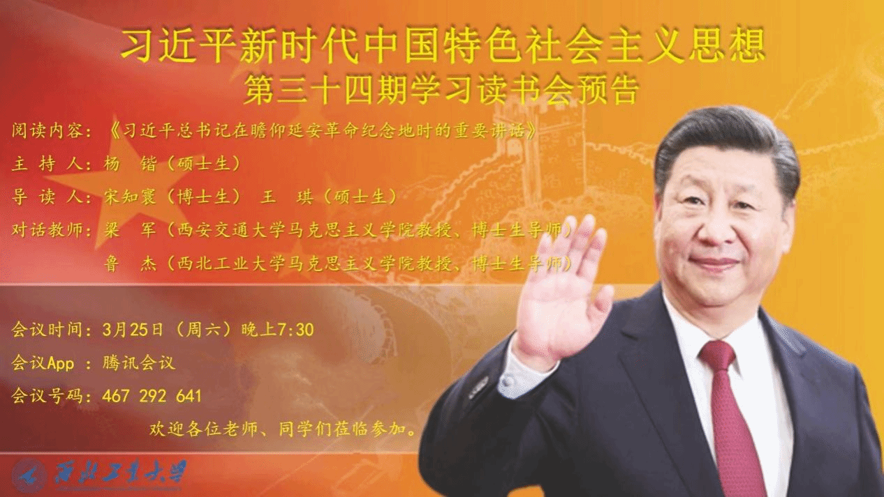 为全面学习贯彻党的二十大精神,推进习近平新时代中国特色社会主义思想进教材、进课堂、进头脑。2023年3月25日,必赢bwin官方网站习近平新时代中国特色社会主义思想学习读书会第三十四期活动主题围绕《习近平总书记在瞻仰延安革命纪念地时的重要讲话》进行学习研讨。本次读书会由我院思想政治教育系主任、博士生导师鲁杰教授发起,学院硕士生杨锴主持,西安交通大学必赢bwin官方网站教授、博士生导师梁军作为对话教师应邀参加。