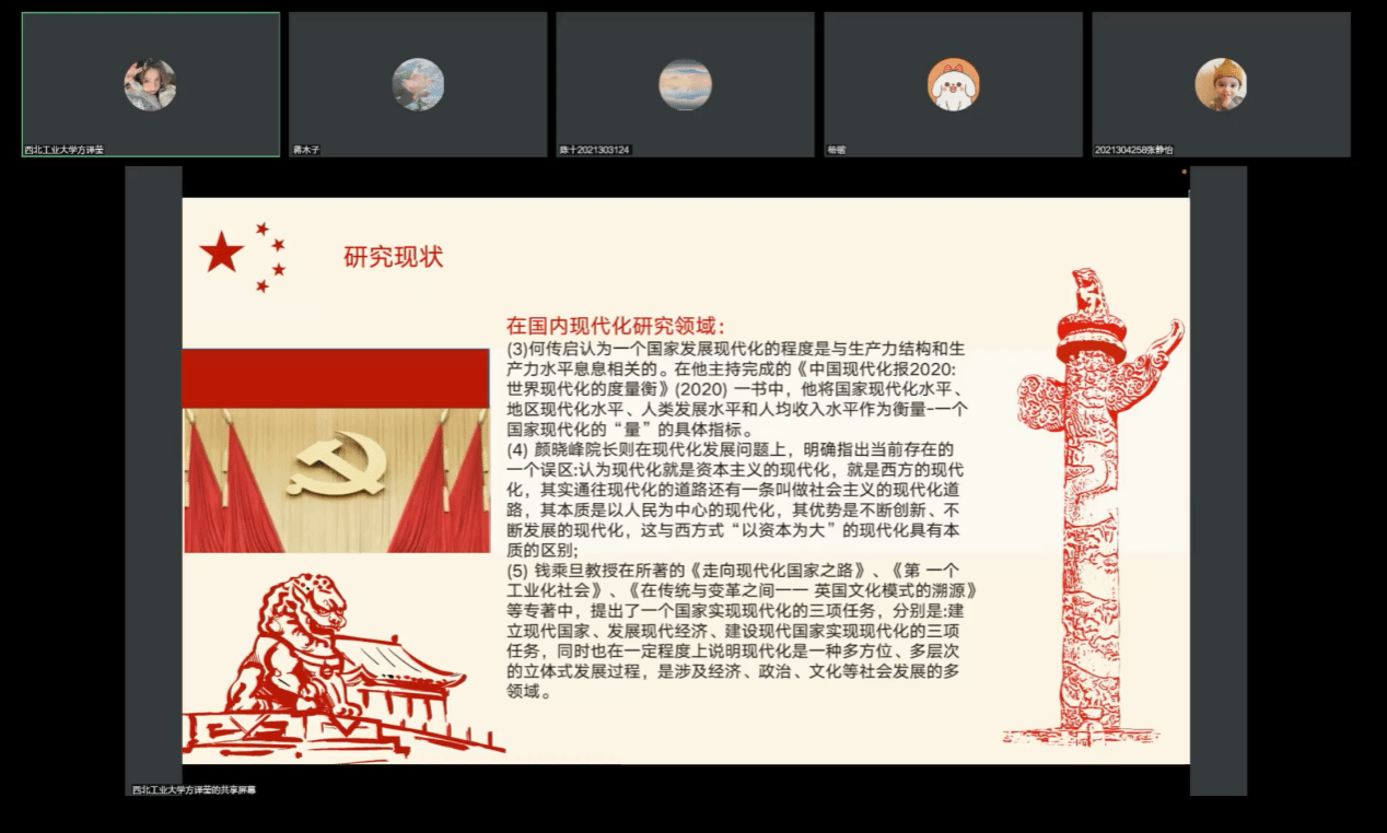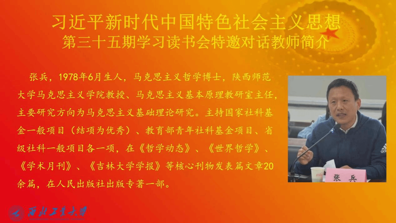 为全面学习贯彻党的二十大精神,推进习近平新时代中国特色社会主义思想进教材、进课堂、进头脑。2023年4月29日,必赢bwin官方网站习近平新时代中国特色社会主义思想学习读书会第三十五期活动主题围绕《习近平在学习贯彻党的二十大精神研讨班开班式上发表重要讲话强调正确理解和大力推进中国式现代化》进行学习研讨。本次读书会由学院思想政治教育系主任、博士生导师鲁杰教授发起,学院硕士生杨锴主持,陕西师范大学必赢bwin官方网站马克思主义基本原理教研室主任张兵教授作为对话教师应邀参加。