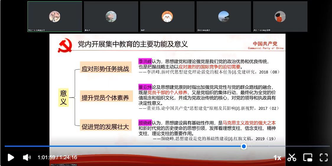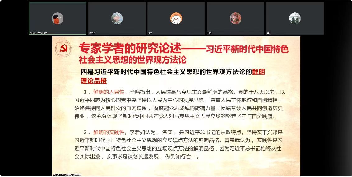 同时,老师们分享了自己学习习近平总书记系列重要讲话的心得,从对历史总问题的把握,对历史客观性的尊重,对历史连续性的关照,对历史发展和目的性的倡导四个方面对同学们讲述了自己的理解,并强调习近平总书记指出,历史是最好的教科书,历史是最好的清醒剂,要在对历史的深入思考中吸收营养,走向未来。要增强历史思维和历史学习,不断进行党的创新理论的学习,在思想和组织行为上不断进步。