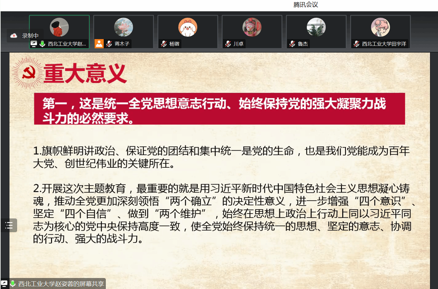 接下来,由我院硕士生田宇洋同学进行导读。她首先通过总结专家学者的论述,介绍了习近平新时代中国特色社会主义思想的历史起点和逻辑起点,并阐述了国内国外的意义。第一部分是对这次讲话的重要意义进行解读,通过结合党的二十大报告,指出了这次讲话是统一全党思想意志行动、始终保持党的强大凝聚力、战斗力;是推动全党积极担当作为、不断开创事业发展新局面;是深入推进全面从严治党、以党的自我革命引领社会革命的必然要求。第二部分是全面准确把握主题教育的目标要求进行了自己的阐释。第三部分从明确领导责任;强化督促指导;注重统筹兼顾;加强宣传引导四个部分来论述如何切实加强对主题教育的领导。最后一部分对学习贯彻习近平新时代中国特色社会主义思想的目的进行总结,即对全党而言要提高运用党的创新理论的能力,对领导干部而言要坚持以身作则、以上率下。