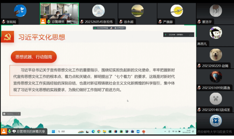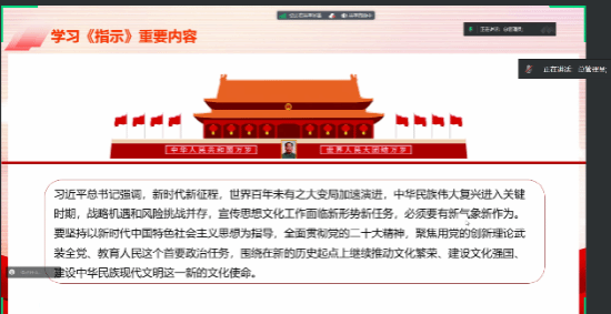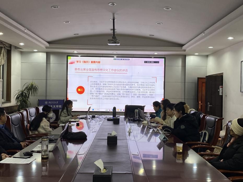 为全面学习贯彻党的二十大精神,推进习近平新时代中国特色社会主义思想进教材、进课堂、进头脑。2023年11月25日,必赢bwin官方网站习近平新时代中国特色社会主义思想学习读书会第三十九期活动主题围绕《习近平对宣传思想文化工作作出的重要指示》进行学习研讨。本次读书会由学院思想政治教育系主任、博士生导师鲁杰教授发起,学院硕士生祁嘉仪主持,西安邮电大学必赢bwin官方网站袁文伟教授作为对话教师应邀参加。本期读书会创新活动举办形式,首次采取线上线下相结合的方式,设置线下分会场,邀请导读同学、对话教师、硕士博士研究生在学院楼208会议室交流学习。