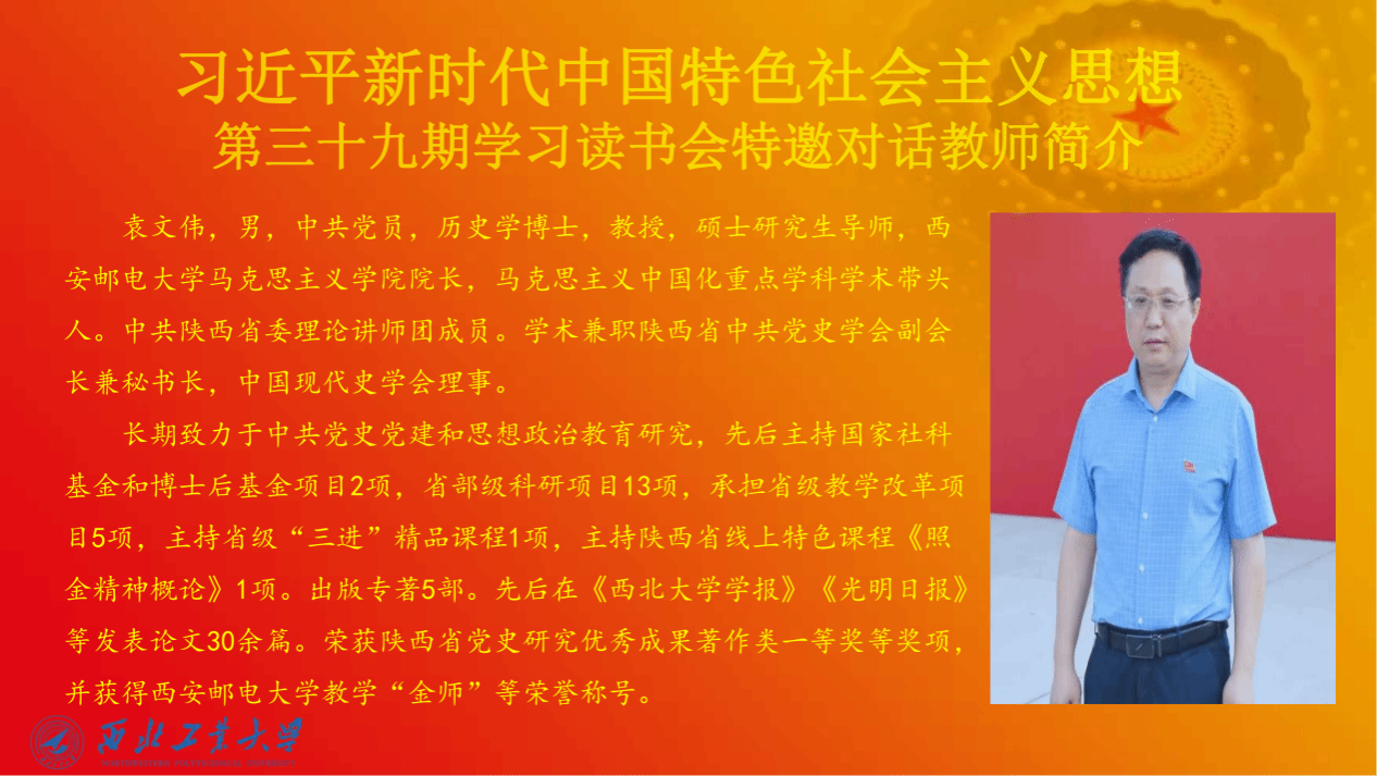 袁文伟,男,任西安邮电大学必赢bwin官方网站院长,马克思主义中国化重点学科学术带头人。中共陕西省委理论讲师团成员。学术兼职有陕西省中共党史学会副会长兼秘书长,中国现代史学会理事。袁教授长期致力于中共党史党建和思想政治教育研究,先后主持国家社科基金和博士后基金项目2项,省部级科研项目13项,承担省级教学改革项目5项,主持省级“三进”精品课程1项,主持陕西省线上特色课程《照金精神概论》1项。出版专著5部。先后在《西北大学学报》《甘肃社会科学》《晋阳学刊》《光明日报》等发表论文30余篇。先后荣获陕西高校人文社会科学研究优秀成果三等奖、陕西省党史研究优秀成果著作类二等奖、陕西省党史研究优秀成果著作类一等奖等多项奖项,曾获陕西省人文社会科学青年英才计划、西安邮电大学“西邮新星”团队建设等计划支持,并被评为学校优秀共产党员、西安邮电大学优秀党务工作者、西安邮电大学“四有好老师”、西安邮电大学教学“金师”诸多荣誉称号。