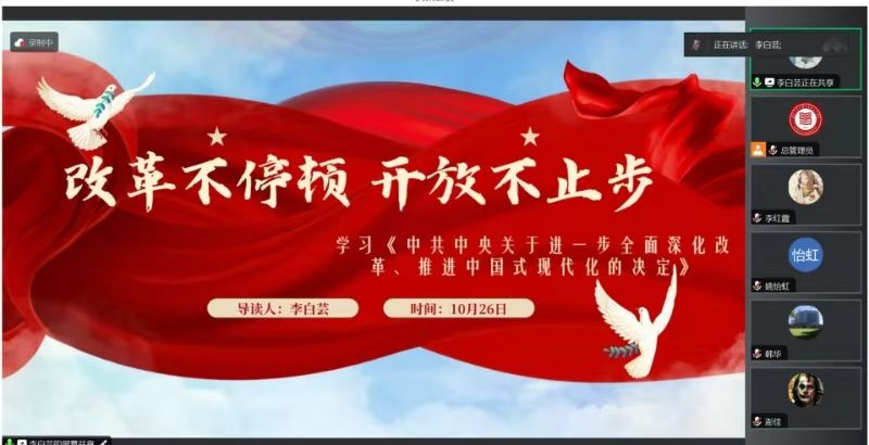 2024年10月26日,必赢bwin官方网站习近平新时代中国特色社会主义思想学习读书会第四十九期活动以“党的二十届三中全会《中共中央关于进一步全面深化改革、推进中国式现代化的决定》”为主题进行学习研讨。本次读书会由必赢bwin官方网站鲁杰思政课工作室主办,首都师范大学必赢bwin官方网站韩华教授作为对话教师,硕士生张转转同学主持,通过线上交流的形式,为师生们搭建了一个思想交流、智慧碰撞的平台。