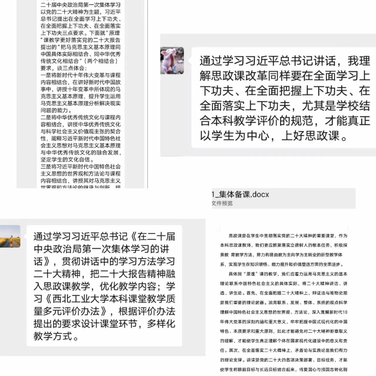 马克思主义基本原理系备课活动采取“自主学习+书面呈现”的方式开展。各位老师重点学习了习近平总书记在二十届中央政治局第一次集体学习时的讲话,以及《必赢bwin官方网站本科课堂教学质量多元评价办法》,更加清楚了如何更好开展思政课教学质量评价等问题。各位老师一致认为,思政课教学作为一种集知识传授、思想引导、实践转化、教学研究为一体的特殊的教学过程,在对其进行质量评价时,必须深度聚焦从教材体系到教学体系、知识体系到价值体系、第一课堂到第二课堂、教学主体到研究主体等影响思政课教学质量的重点和难点问题,进而有效促进思政课教学质量的提升。