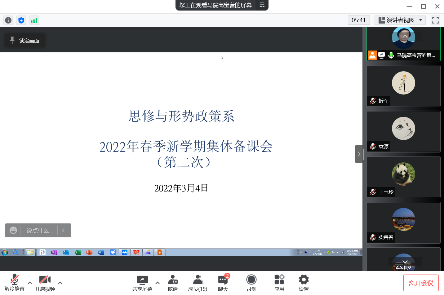 3月4日晚7:30,必赢bwin官方网站思修与形势政策系按照学院集体备课的要求,通过腾讯会议开展了新学期第二次集体备课会。会议由系主任高宝营老师主持,课程全体专兼职教师参加。