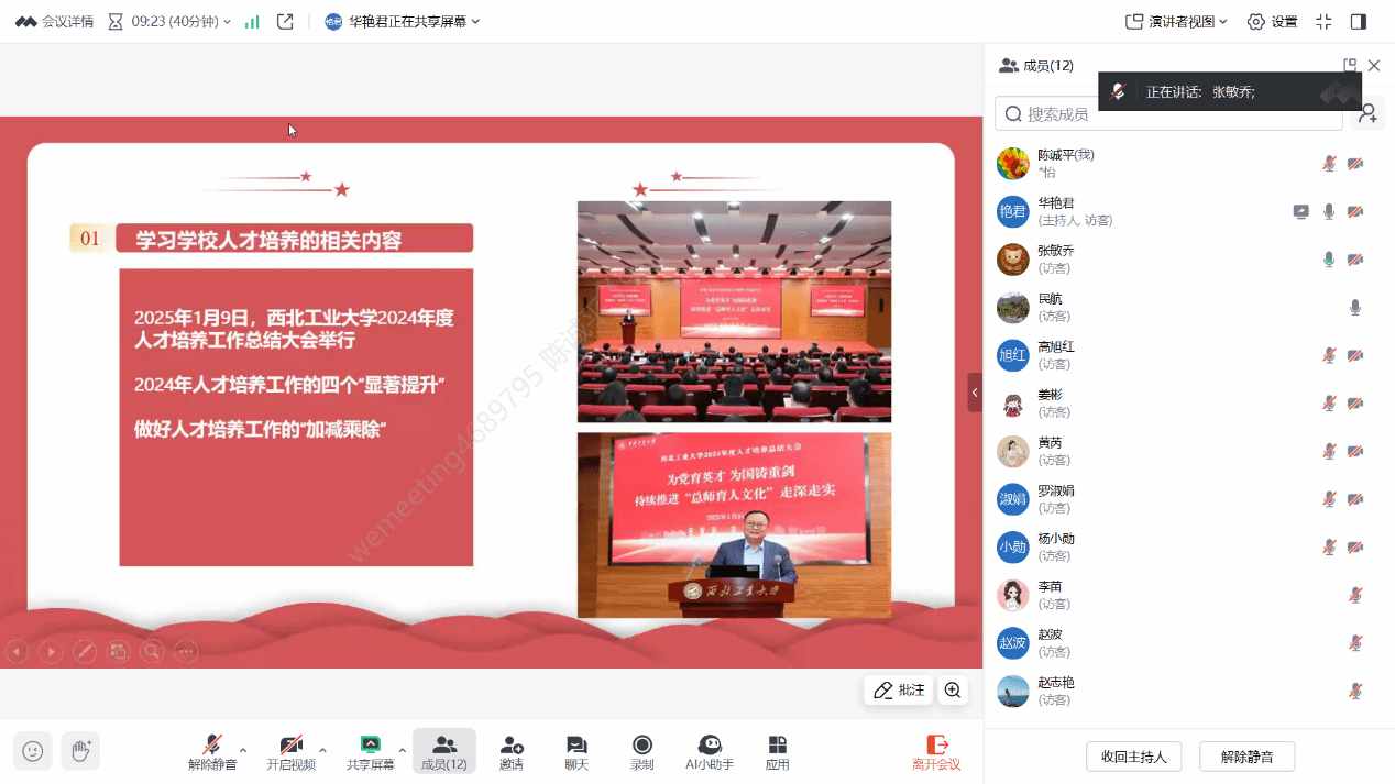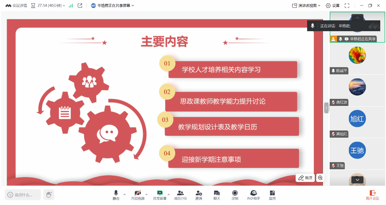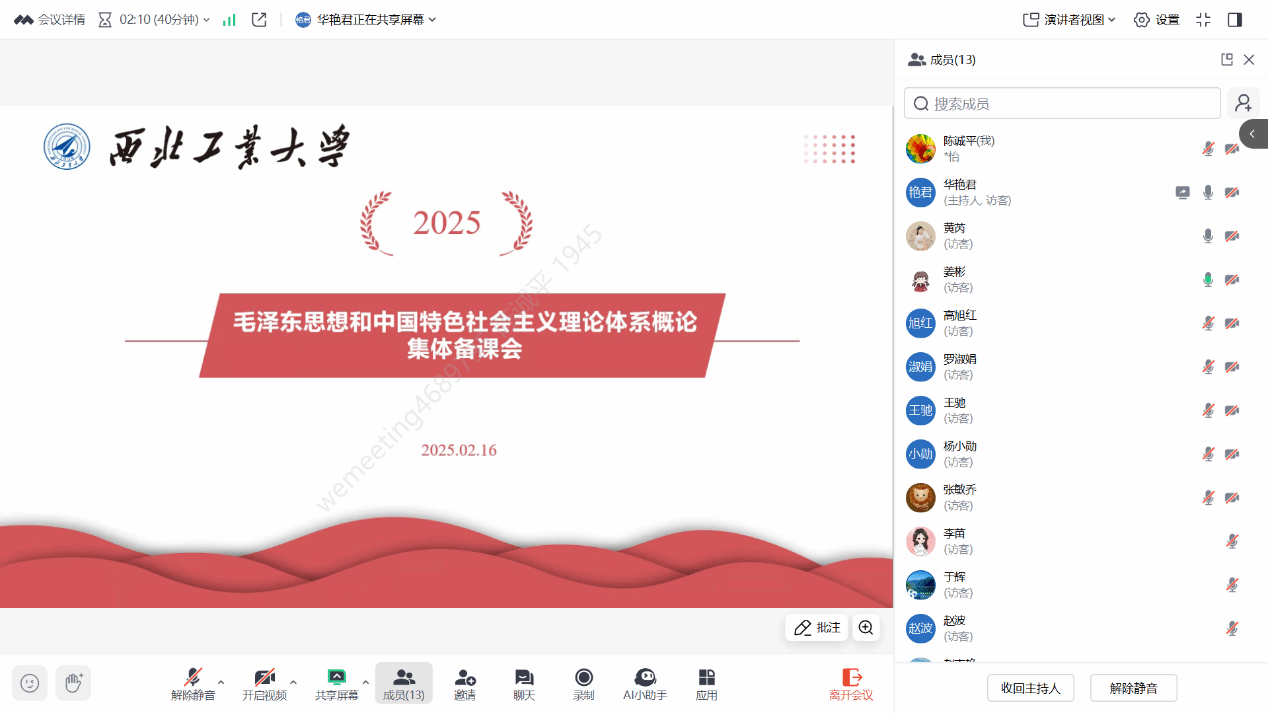 2025年2月16日晚,必赢bwin官方网站马克思主义中国化研究系通过在线会议的方式开展新学期第一次集体备课,会议围绕“深入学习学校人才培养会议精神,有效提升思政课教师教学水平”展开。备课会由教学主任华艳君主持,全体专兼职教师参加会议。