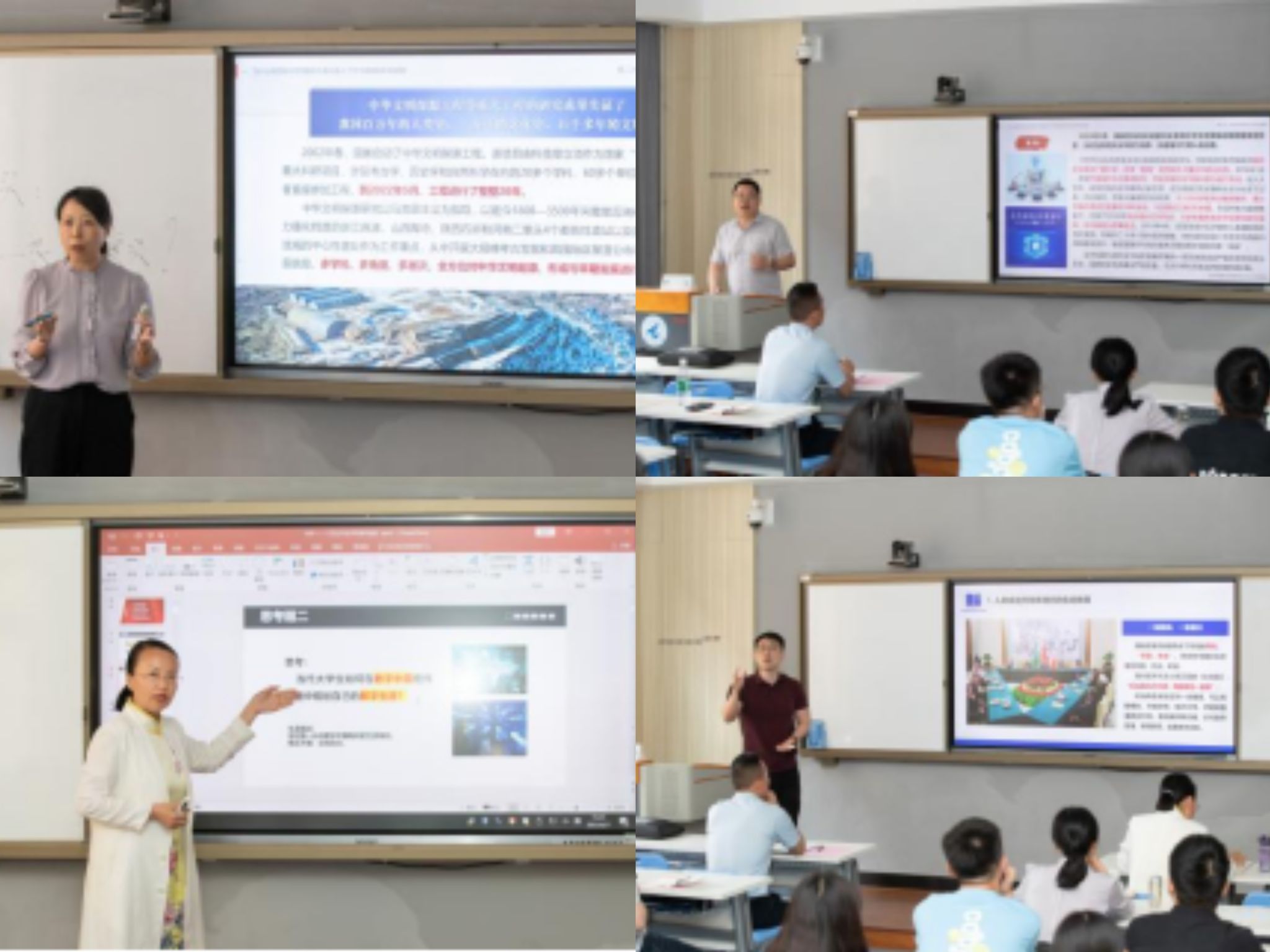 接着,《概论》课程教师薛金慧、孙绍勇、宁殿霞、吕焰四位老师先后围绕《坚持和发展中国特色社会主义的总任务》《建设社会主义文化强国》《习近平经济思想》《习近平外交思想》等四个方面进行了课程示范环节。同学们在整个教学过程中积极分享,踊跃提问,开展了互动式教学。薛金慧老师从中华民族伟大复兴的角度出发,运用巧妙的问答方式,启发同学们中华民族的伟大复兴是一个由”兴“到”衰“再到”兴“的过程。孙绍勇老师则从具体案例出发给出了网络意识形态的治理经验。宁殿霞老师通过”三河一山“绿道的典型案例,深刻阐明了坚持以人民为中心的发展思想的重要性。吕焰老师通过展示各国外交的具体案例以及我国外交事业的发展情况,指出了我国始终高举和平与发展的旗帜,在构建人类命运共同体的过程中贡献着中国智慧、提供中国方案。张丽丽老师对教学展示进行了点评,她认为薛老师、吕老师在讲中国梦、外交思想中呈现出的感染力和引导学生共情的能力。孙老师密切联系实际用学生身边的案例讲网络意识形态,在传授课堂知识同时还进行了有效的国家安全教育。宁老师用严密的逻辑和清晰的思路,将习近平经济思想与政治经济学理论进行融合,呈现了习近平经济思想的全貌,体现出充分的课前准备和课堂设计,张丽丽老师最终对四位老师精心准备的课程展示表达了感谢。